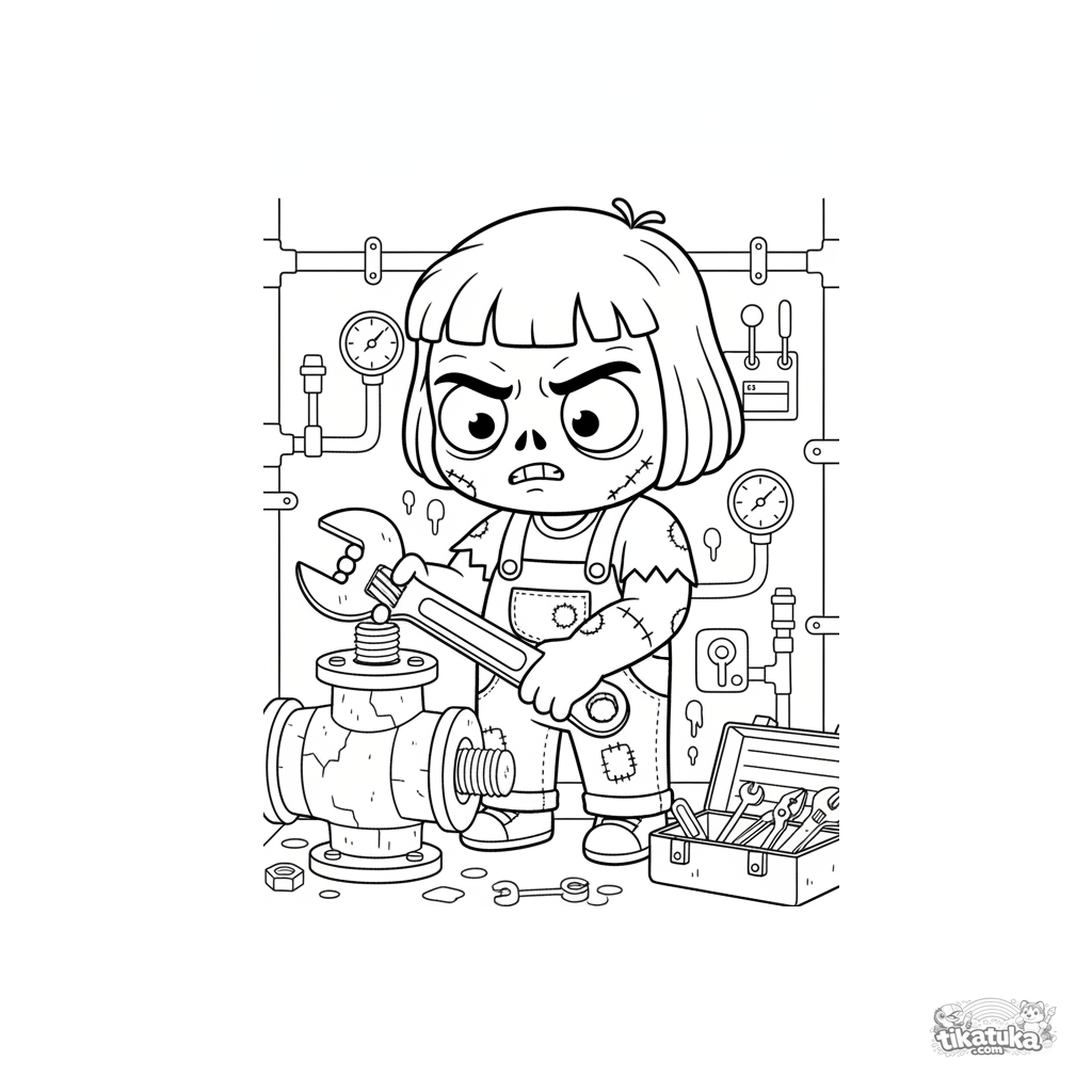 Ausmalbild für Kinder: Ein Zombie-Mechaniker repariert eine große Pumpe an einer Station im Kanal. Klare Formen, verständliche Szene. Für Kinder von 4-6 Jahren.