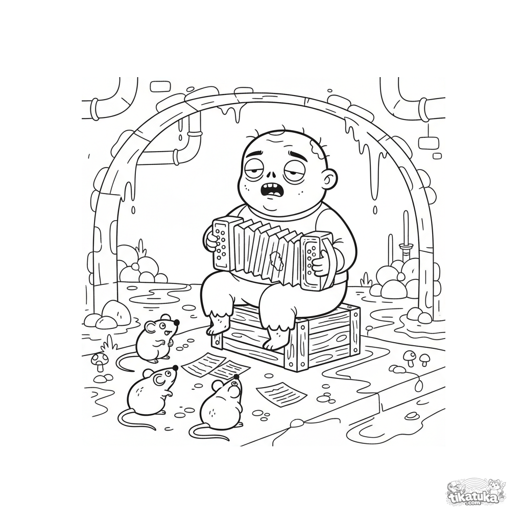 Ausmalbild für Kinder von 4-6 Jahren: ein fröhlicher Zombie-Musiker spielt Akkordeon auf einer Plattform im Sammelkanal. Klare Szene für Jungen.