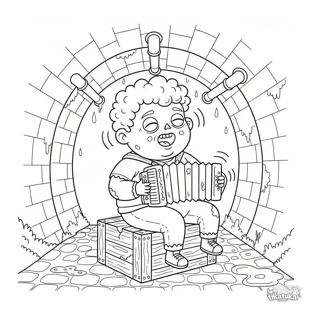 Ausmalbild für Kinder 7-9: Ein fröhlicher Zombie-Musiker spielt Akkordeon in einem Abwasserkanal. Lebhafte Volksstil-Szene.