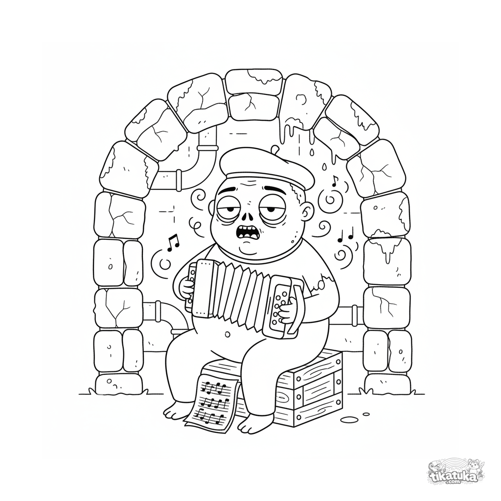 Ausmalbild für Kinder von 7-9 Jahren: ein wohlgenährter Zombie-Musiker mit Baskenmütze spielt Akkordeon unter einem Backsteinbogen in einem Abwasserkanal. Eine dynamische und ausdrucksstarke Szene.