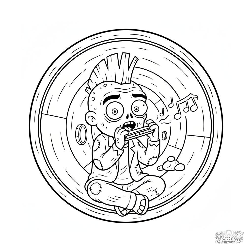 Ausmalbild für Kinder 7-9: ein fröhlicher Zombie mit einem Irokesenschnitt spielt Mundharmonika, während er in einem großen Abwasserrohr sitzt. Dynamische Szene mit Noten.