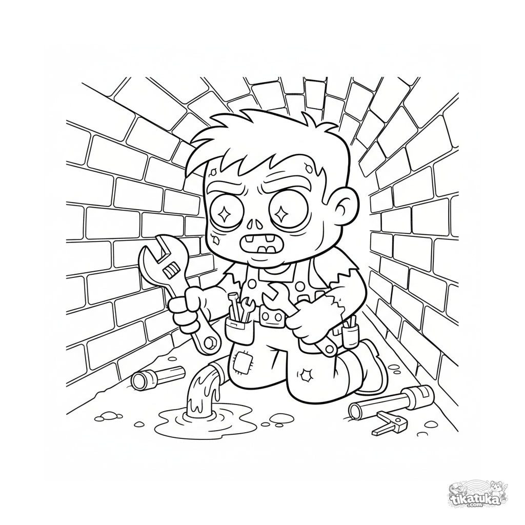 Ausmalbild eines freundlichen Zombie-Klempners, der ein Rohr im Kanaltunnel repariert. Für Kinder von 7-9 Jahren. Eine lustige und nicht zu gruselige Szene.