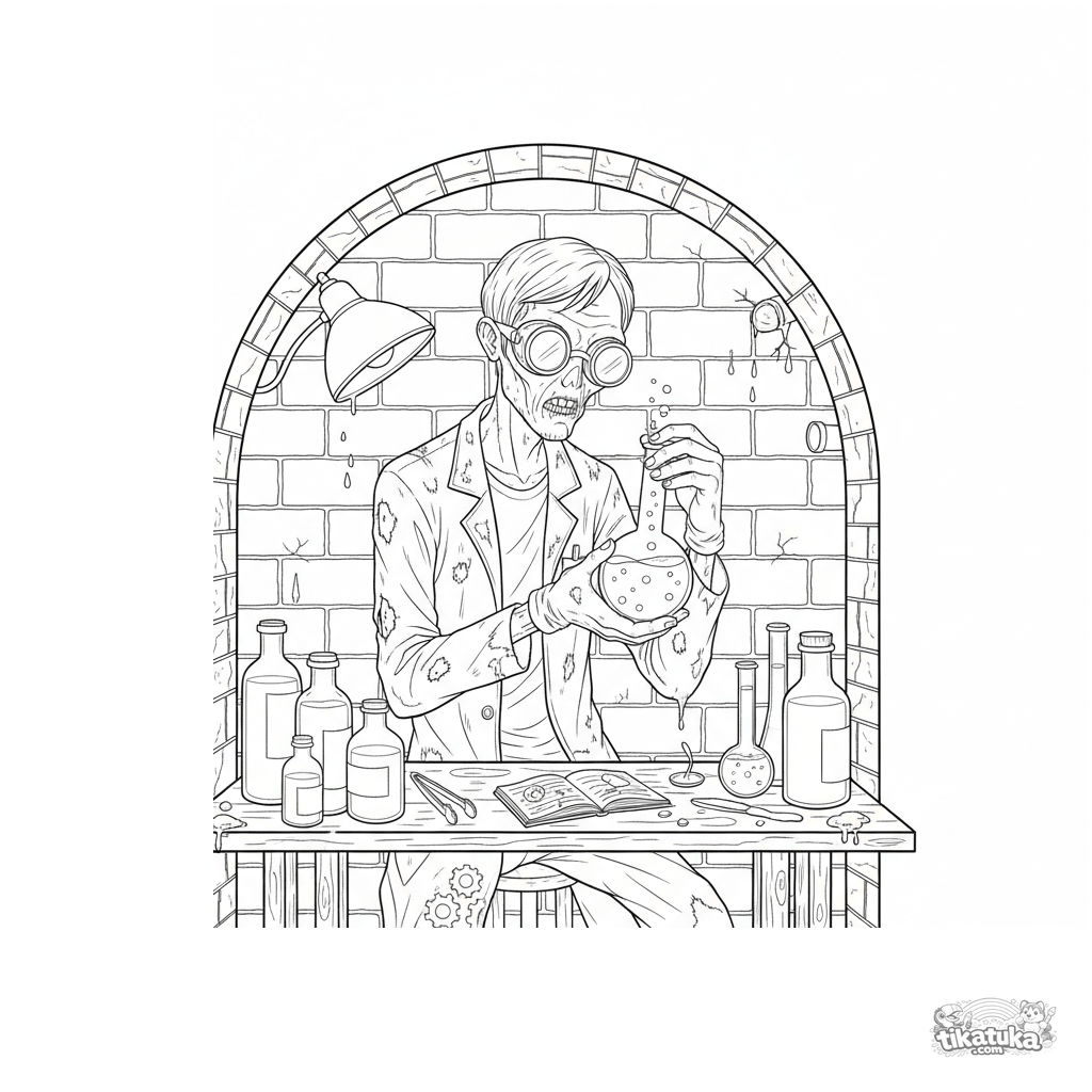 Komplexes Ausmalbild für Kinder 10-12: ein Zombie-Wissenschaftler in einem Labor im Kanaltunnel untersucht Wasserproben. Detaillierte technische Szene.