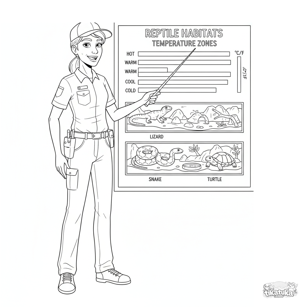 Ausmalbild für Kinder von 10-12 Jahren. Ein Zoo-Freiwilliger erklärt ein Temperatur-Diagramm für Reptilien anhand einer Informationswand. Detaillierte wissenschaftliche Illustration.