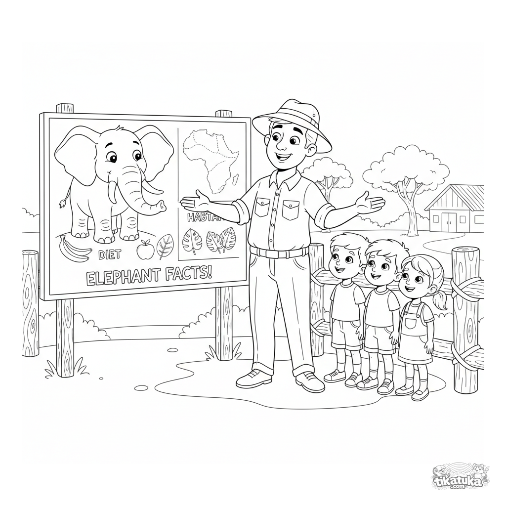 Detailliertes Ausmalbild: Ein Zoopfleger erklärt Kindern die Ernährung eines Elefanten anhand einer großen Info-Tafel.
