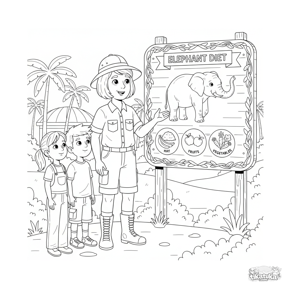 Ausmalbild für Kinder 10-12: Ein Zootierpfleger erklärt ein Elefanten-Ernährungsschild. Detaillierte pädagogische Illustration über Berufe und Biologie.