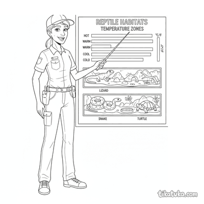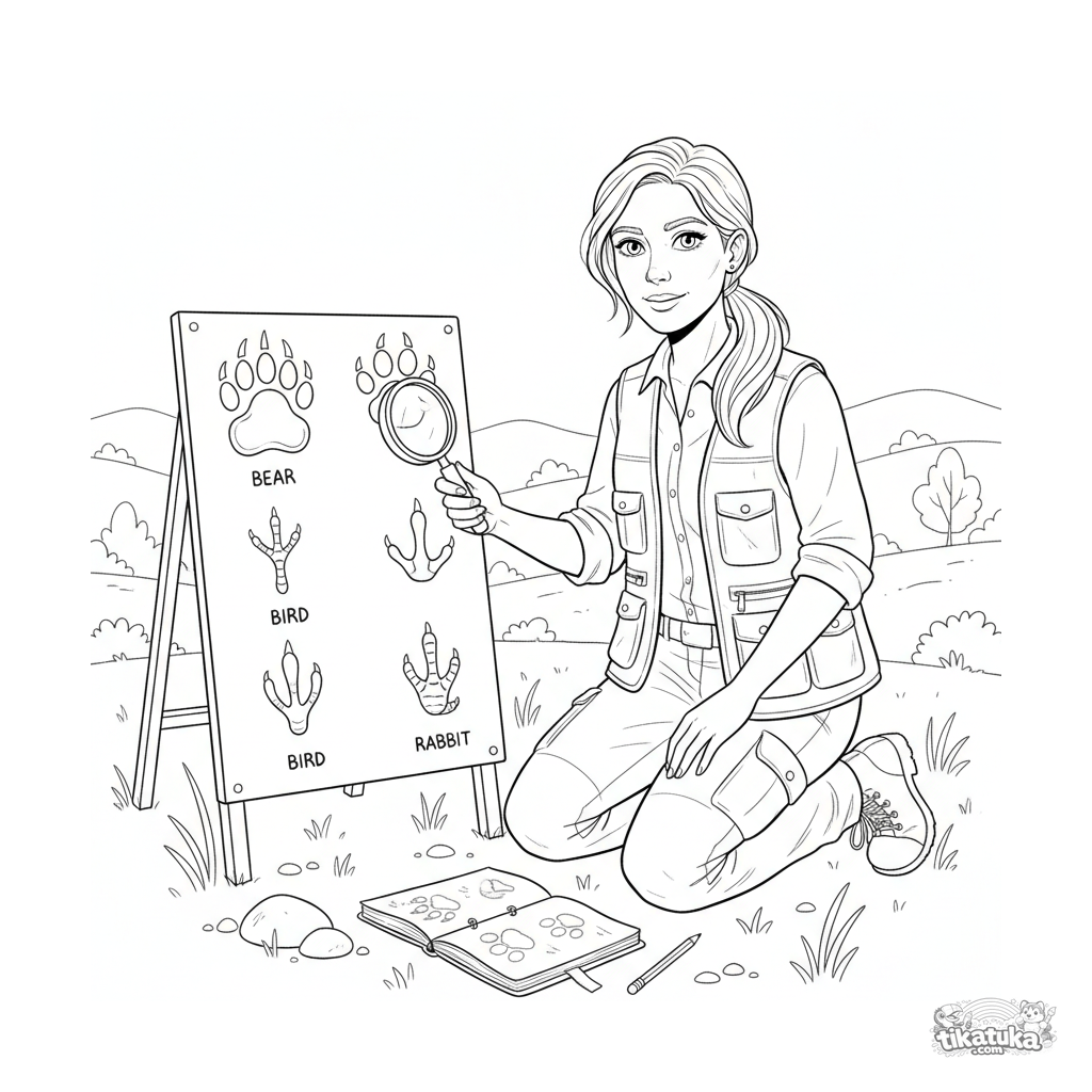 Ausmalbild für Kinder 10-12: Ein Zoologe untersucht und vergleicht verschiedene Tierfährten an einem Infobrett im Zoo. Detaillierte lehrreiche Szene.