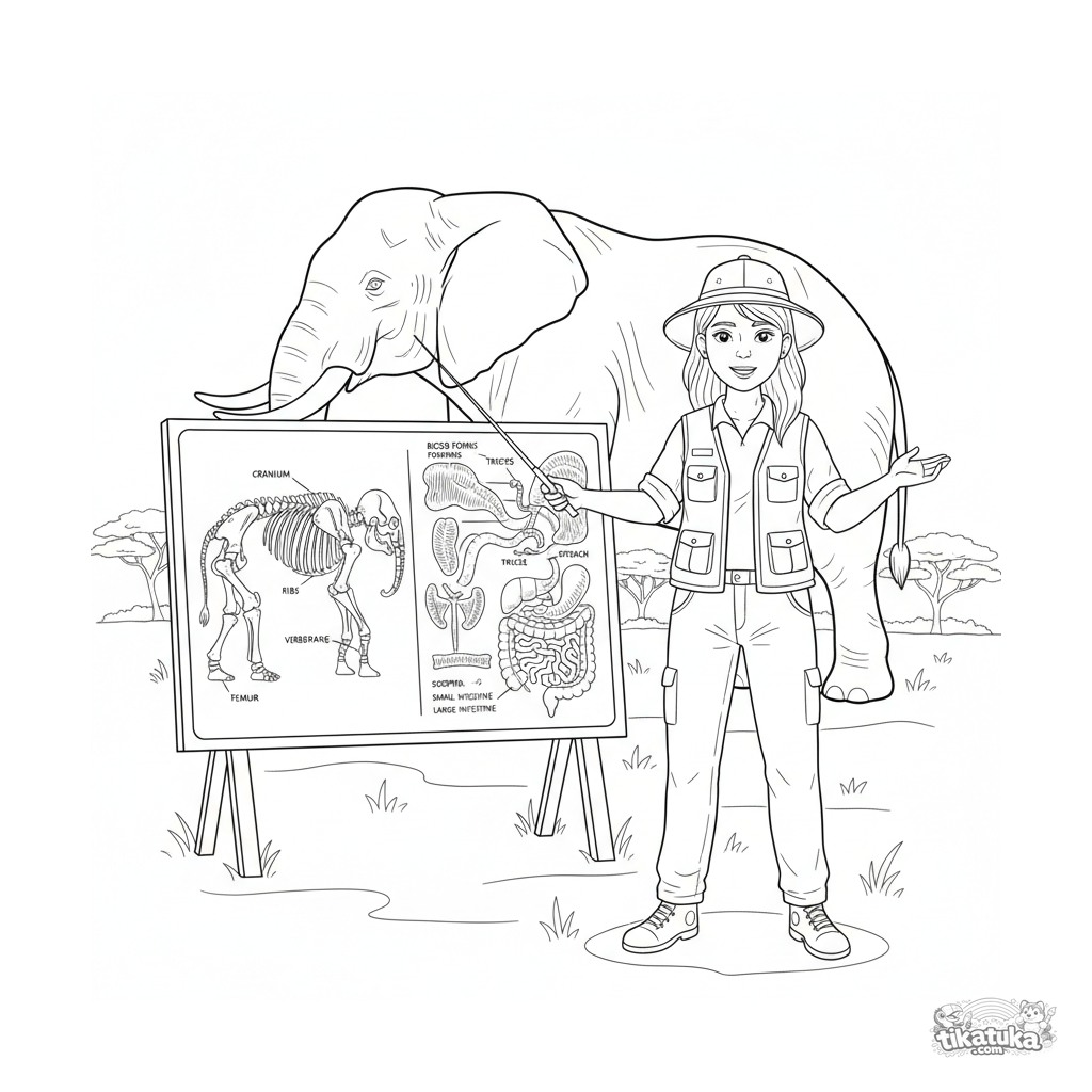 Ausmalbild für Kinder 10-12: Ein Zoologe an einem detaillierten Elefanten-Anatomie-Infoboard im Zoo. Detaillierte Lehrszene.