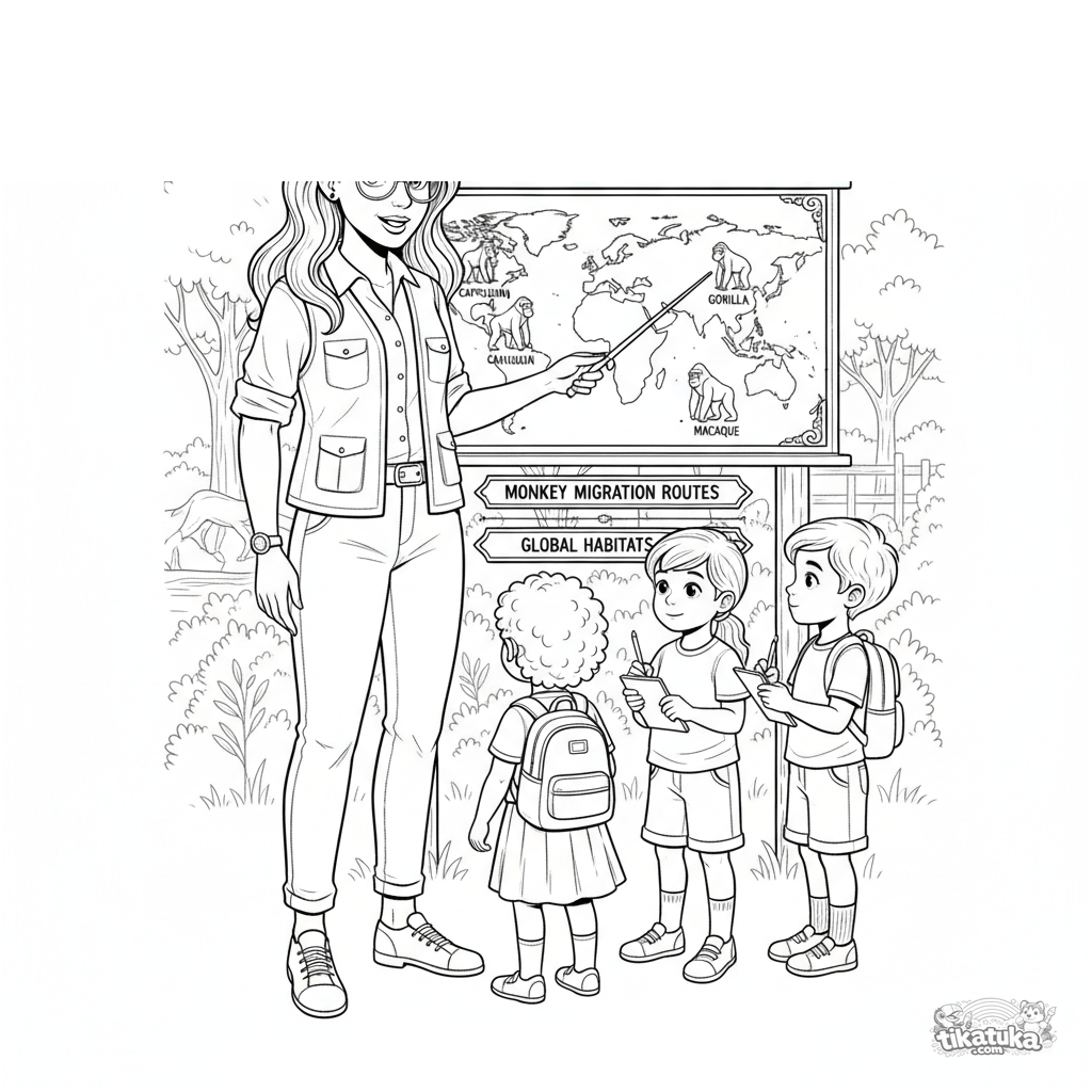 Ausmalbild für Kinder 10-12: Ein Zoologe erklärt eine Affen-Lebensraum-Verteilungskarte auf einem Zooschild. Detaillierter Gravierstil, Geographie und Biologie lernen.