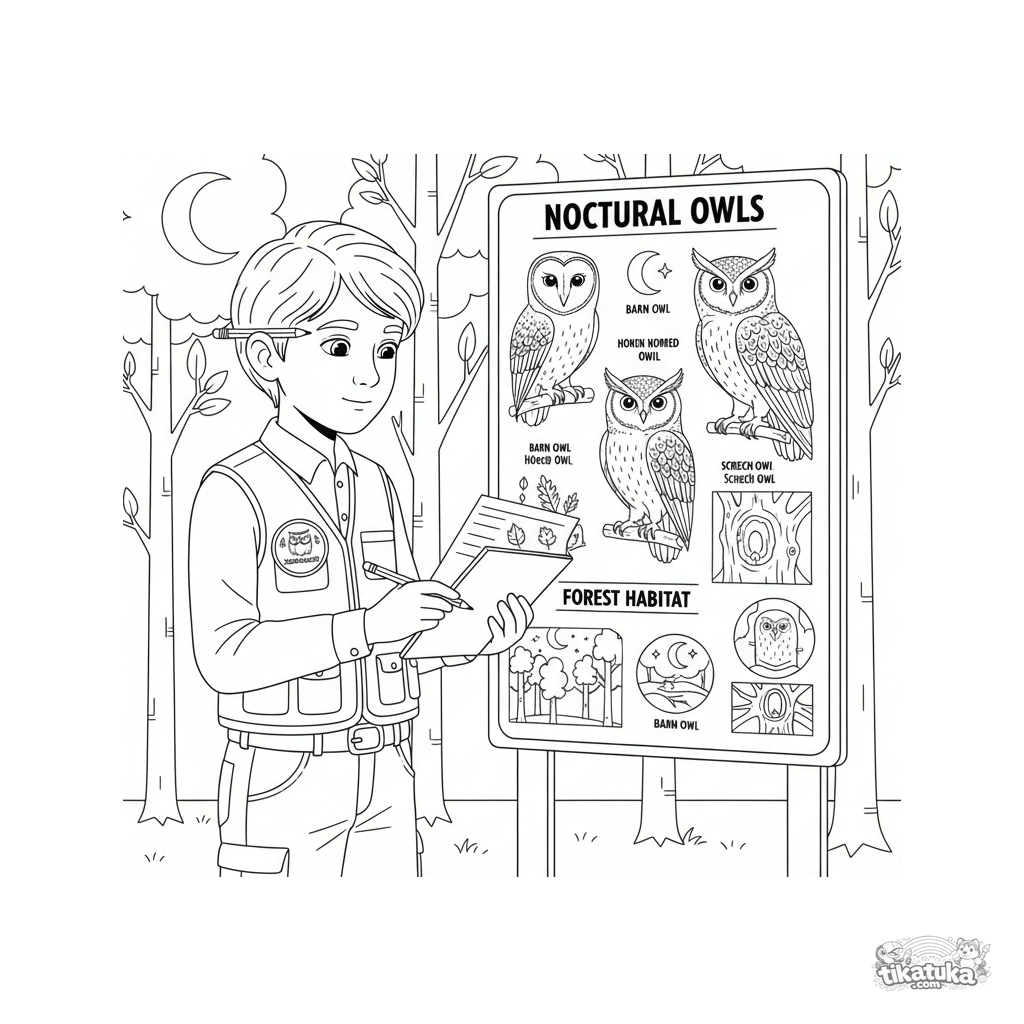 Ausmalbild für Kinder 10-12: Ein junger Zoologe skizziert Notizen an einem Informationsschild über Eulen im Zoo. Detaillierte Lernszene für Natur- und Wissenschaftsfans.