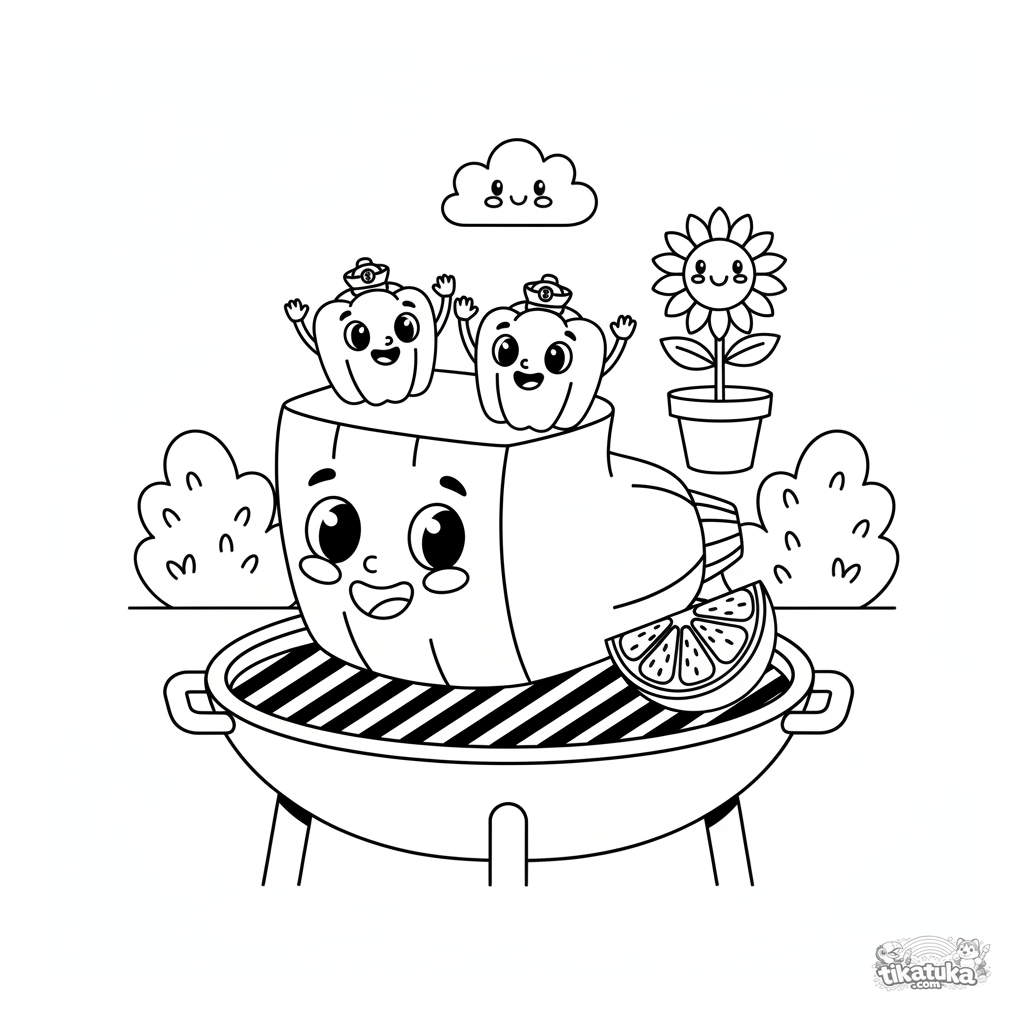 Ausmalbild für Tweens 7-9 Jahre: ein Zucchini-Boot mit Paprika-Seglern auf einem Gartengrill.