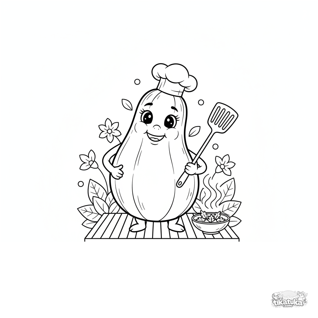 Ausmalbild für Kinder 4-6: Eine lächelnde Zucchini mit Kochmütze kocht auf einem Gartengrill.