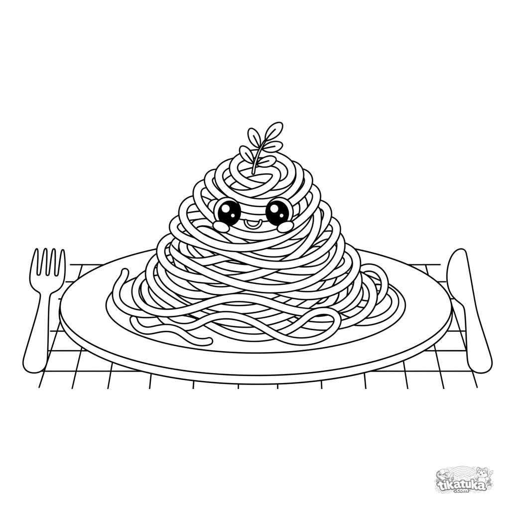 Ausmalbild einer Zucchini-Nudelspirale auf einem Teller. Für Kinder von 7-9 Jahren. Lustige lockige Gemüseform, garniert mit Kräutern.