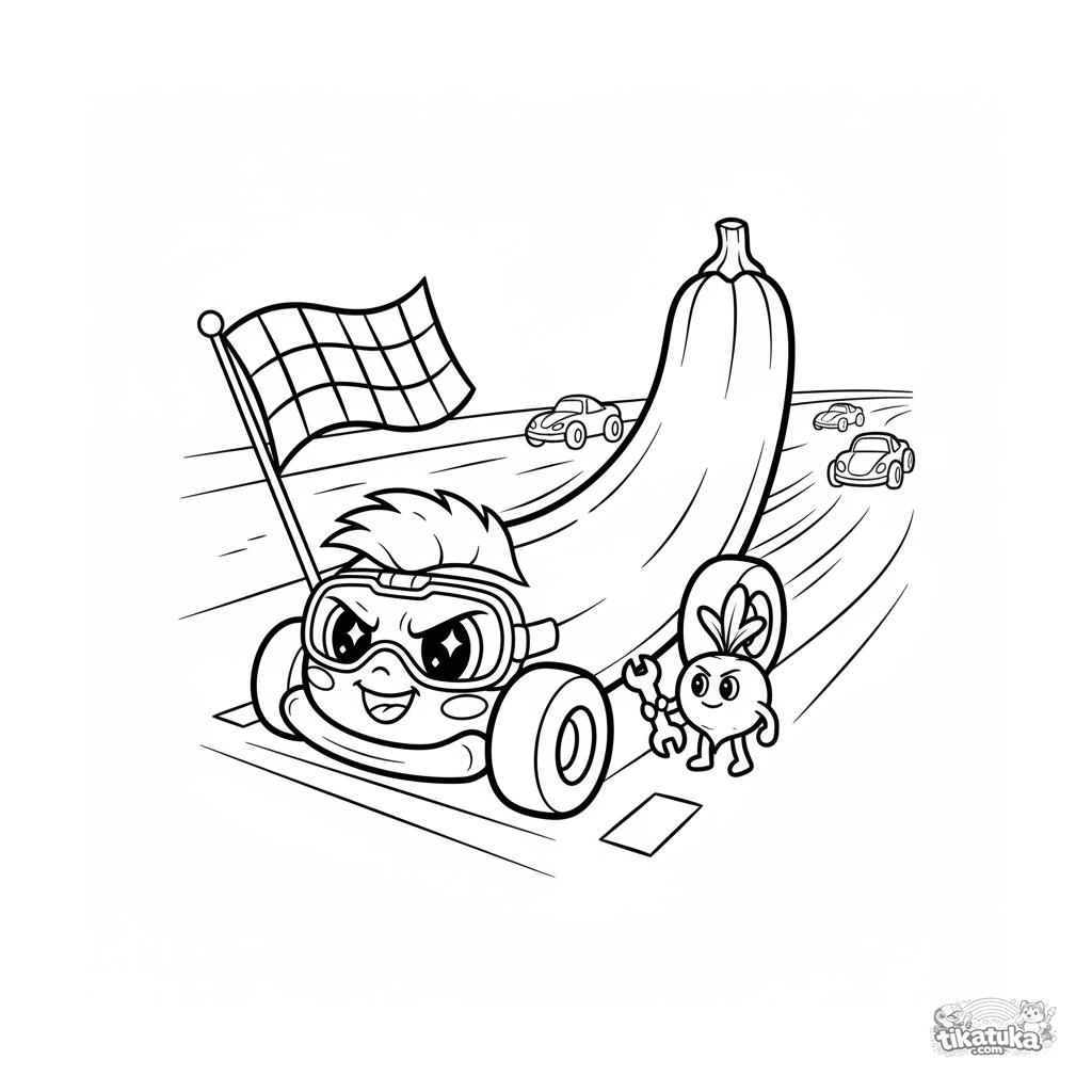 Dynamisches Ausmalbild für Kinder 7-9: Eine Zucchini als Rennwagen an der Startlinie. Comic-Stil, ausdrucksstarke Details.