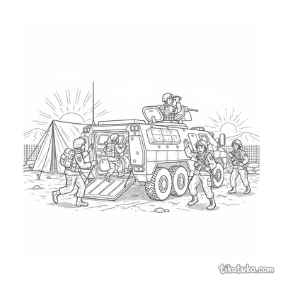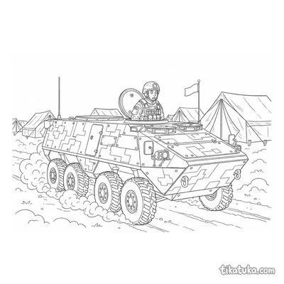 Gepanzertes Mannschaftstransportfahrzeug patrouilliert am Lagerrand