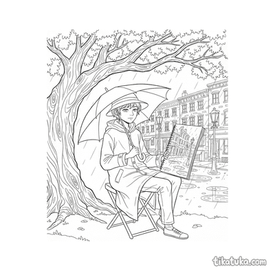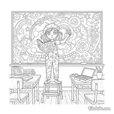 In den Malvorlagen sind Künstler und Maler in vielen Situationen zu sehen: Ein Mädchen malt einen großen Regenbogen auf eine Leinwand, während ein Junge ein Wandbild an eine Tafel zaubert. Ein Husky-Künstler, eine Eule und sogar eine Capybara halten den Pinsel in der Hand. Andere Bilder zeigen Künstler an der Staffelei, im Schlosshof oder dabei, wie sie ein riesiges Wandbild an eine Stadtmauer malen. Fantasievolle Szenen wie ein Maler-Amöbe oder ein Minotaurus-Künstler in einer Labyrinth-Halle laden zum Ausmalen ein.