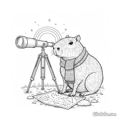 Capybara-Astronom mit Teleskop bei Sonnenuntergang
