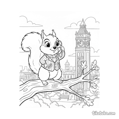 Eichhörnchen auf Parkbank mit Teleskop