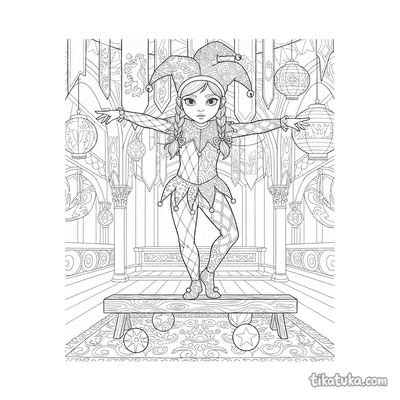 Mädchen in Narrenkostüm balanciert auf niedrigem Balken