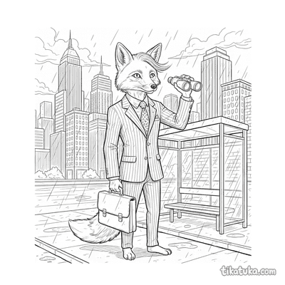 Geschäfts-Fuchs mit Aktentasche und Fernglas an der Bushaltestelle