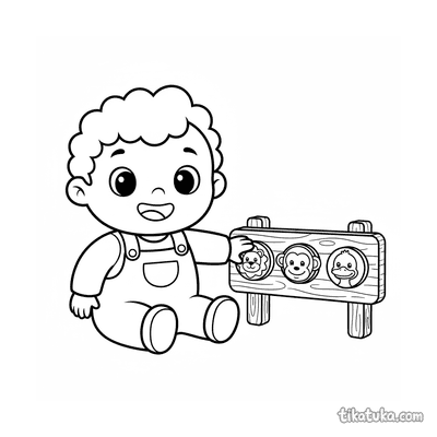 Kleinkind mit Tiergeräusche-Knöpfen-Schild