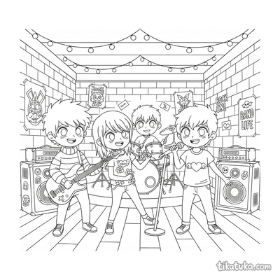 Diese Club-Ausmalbilder zeigen verschiedene Gruppen und ihre gemeinsamen Aktivitäten. Die Szenen spielen in Proberäumen, Clubkellern oder gemütlichen Treffpunkten.