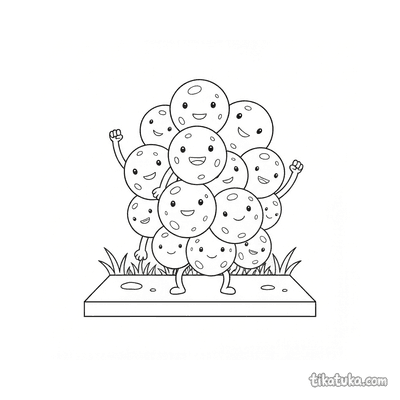 In den Bildern sind die Traubenmikroben als Fußballmannschaft, als tanzende Gruppe oder als Band zu sehen. Andere Motive zeigen eine einzelne Traube mit Tautropfen oder die Mikroben beim Seilspringen und Feiern. Die Ausmalbilder bieten klare Schwarz-Weiß-Konturen, die sich gut ausdrucken lassen. Du kannst alle 11 Vorlagen direkt herunterladen und für deine Malstunde nutzen.