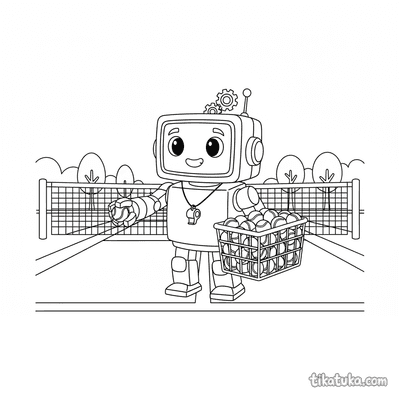 Tennis-Roboter-Trainer mit Korb voller Bälle