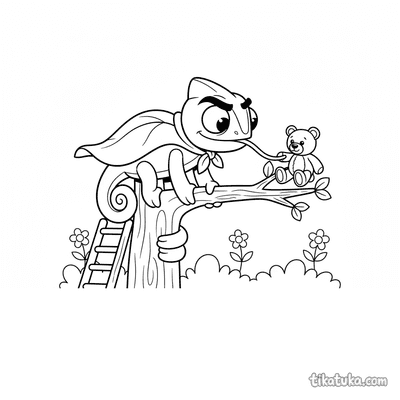 Chamäleon Radik Superheld rettet Teddybär vom Baum