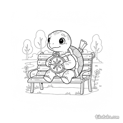 Schildkröte mit Kompass auf Parkbank