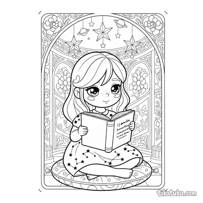 Als Sternbild verkleidetes Mädchen liest Buch unter Papiersternen