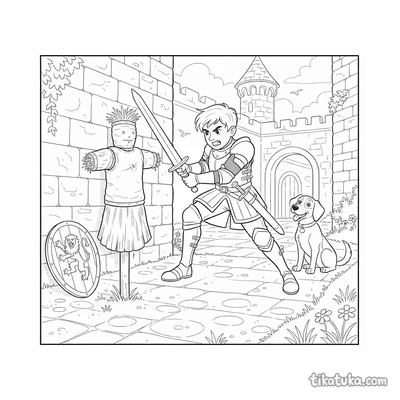 In dieser Sammlung findest du junge Ritter, die im Schlosshof mit Holzschwertern üben oder gegen Strohpuppen fechten. Auch verspielte Welpen, die ihrem Schwanz nachjagen oder Seifenblasen fangen, sowie jonglierende Kinder sind auf den Malvorlagen zu entdecken. Alle 26 Bilder sind in klaren Schwarz-Weiß-Konturen gehalten, die sich leicht ausdrucken lassen. Du kannst die Vorlagen für dein Malprojekt herunterladen oder direkt am Bildschirm mit Farben füllen.