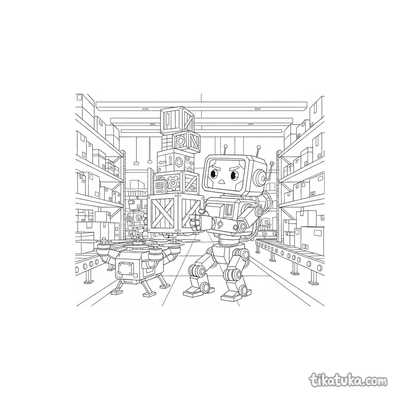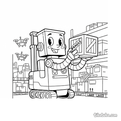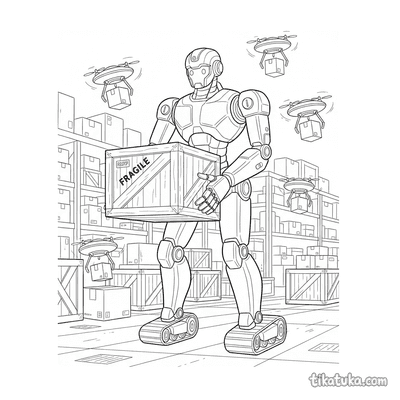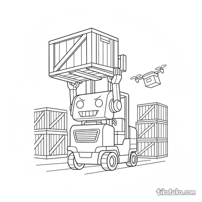 In den Bildern werden Kisten von Robotergabelstaplern gestapelt oder von neugierigen Forscherrobotern erkundet. Es gibt auch Szenen, in denen Versorgungslaster Kisten entladen oder Roboterhunde Werkzeugkisten holen. Die klaren Schwarz-Weiß-Konturen der Kisten und Maschinen sind ideal für Kinderhände. Du kannst alle 10 Motive einzeln herunterladen oder bequem als PDF-Set ausdrucken, um sofort mit dem Ausmalen zu beginnen.