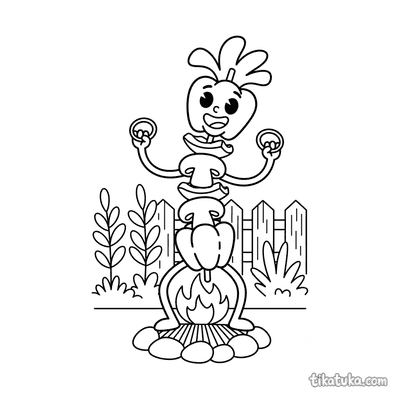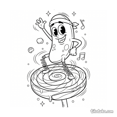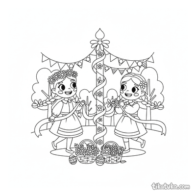 Die Ausmalbilder zeigen eine bunte Mischung aus tanzenden Figuren und festlichen Momenten. Dazu gehören eine Hip-Hop-Crew in der Stadtgasse, Kinder, die um einen Maibaum tanzen, eine Kawaii-Tänzerin auf dem Nachtmarkt, eine Flussnymphe im Wald und ein tanzender Virus mit Spitzen.