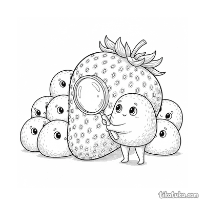 Neugieriger Erdbeer-Mochi untersucht eine Riesen-Erdbeere