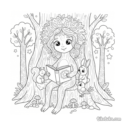 Verspielter Baum-Ent liest Buch kleinen Tieren in Baumhöhle vor