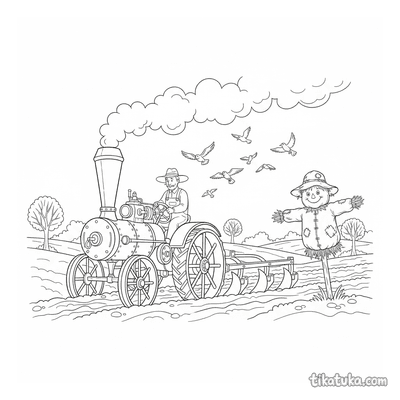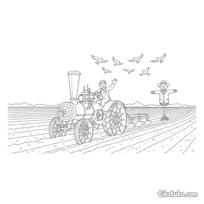 Zu den Motiven gehören alte Dampftraktoren beim Pflügen oder auf Kürbis- und Weizenfeldern, Bauern bei der Arbeit und flauschige Welpen, die über das Feld tollen. Jede Szene erzählt eine kleine Geschichte vom Leben auf dem Land. Alle 98 Malvorlagen sind in klaren Schwarz-Weiß-Konturen gehalten, die sich leicht ausdrucken lassen. Du kannst die Bilder direkt online ausmalen oder sie als PDF herunterladen, um mehrere Kopien für eine ganze Kindergruppe zu haben.