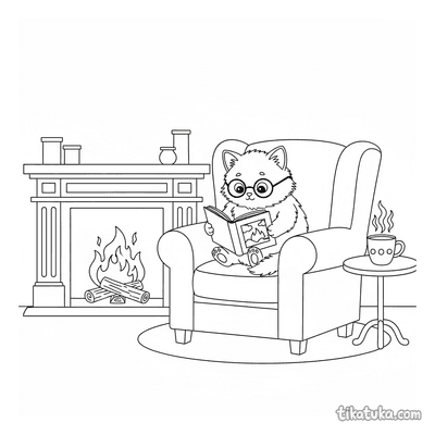 Kätzchen Liest Buch am Kaminfeuer
