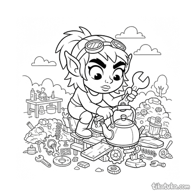Kobold-Ingenieur bastelt an Flugmaschine in Schrottplatz-Werkstatt