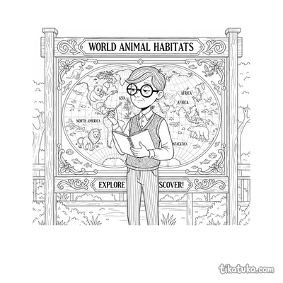 Die Geografie-Ausmalbilder zeigen Szenen wie eine Familie, die eine Pinguin-Arten-Karte vergleicht, oder eine detaillierte Illustration eines Elefanten-Schutz-Schildes. Auch eine Maus als Kartograf mit einer alten Landkarte, ein Koala-Lehrer an der Tafel und eine Zoo-Karte mit Windrose gehören zu den Motiven. Alle 11 Schwarz-Weiß-Vorlagen sind mit klaren Konturen gestaltet, damit sie sich leicht ausdrucken und in der Schule oder zu Hause verwenden lassen. Du kannst die Geografie-Bilder einzeln herunterladen oder gleich mehrere Seiten auf einmal für ein Projekt ausdrucken.