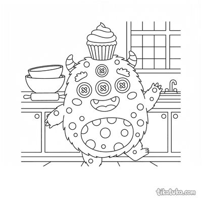 Flauschiges Monster tanzt mit einem Cupcake