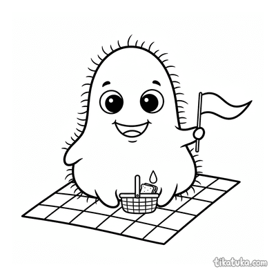 Freundliches Amöben-Mikrobe mit Glubschaugen und Wimpern hat ein Picknick