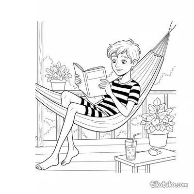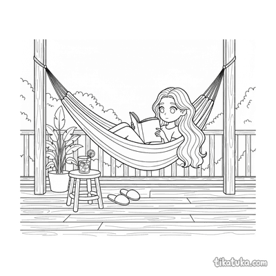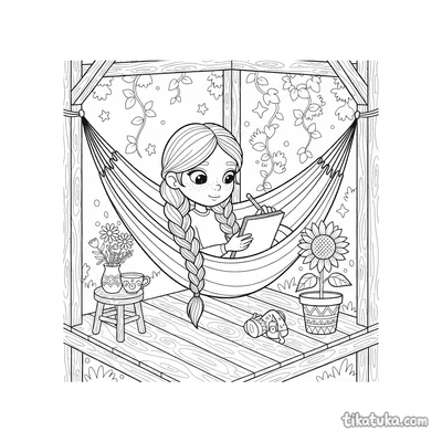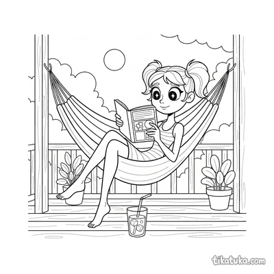 Die Ausmalbilder mit HĂ€ngematten bieten eine gemĂŒtliche AtmosphĂ€re. Sie zeigen zum Beispiel ein schlĂ€friges Klecks-Monster, das zwischen BĂ€umen nickert, ein MĂ€dchen, das auf der Veranda liest, oder ein Capybara beim Sonnenuntergang. Auch Alltagsszenen wie ein Opa, der ein Netz flickt, oder ein Teenager, der den Blick von der Veranda zeichnet, sind dabei.