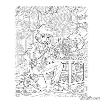 Mecha-Pilotenschüler repariert einen Roboterarm im Hangar