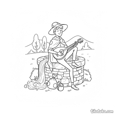 Wandernder Spielmann ruht am Brunnen