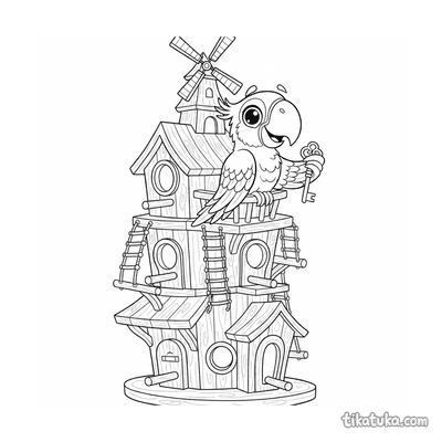 Papagei lugt aus einem mehrstöckigen, schicken Vogelhaus