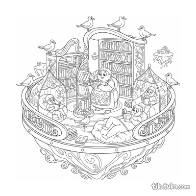 In den Bildern warten ein freundliches Bakterium zwischen den Regalen, ein Husky als Bibliothekar und eine Eule im Baumhaus. Kinder treffen auf eine Prinzessin auf einem Buch-Schlitten, einen WaschbĂ€ren, der fallende BĂŒcher fĂ€ngt, und junge Schreiber in einer Palastbibliothek. Die klaren Schwarz-WeiĂ-Konturen der Malvorlagen sind ideal, um die Details jeder Bibliotheksszene gut zu erkennen und auszumalen. Du kannst alle Bilder kostenlos herunterladen und fĂŒr deine Kinder oder eine ganze Gruppe ausdrucken, um sie mit Stiften und Farben zum Leben zu erwecken.