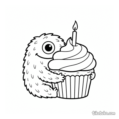 Süßes, pelziges Monster mit einem Auge umarmt einen Riesen-Cupcake