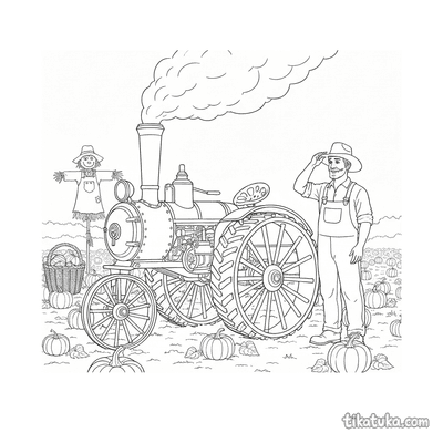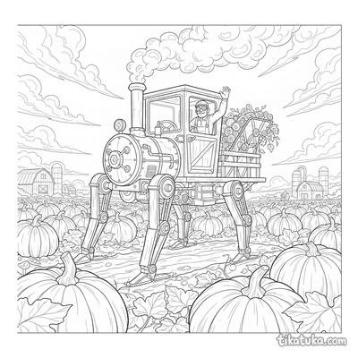 Die Ausmalbilder mit Kürbissen erzählen kleine Geschichten vom Herbst: Ein alter Dampftraktor erntet die Feldfrüchte, ein Pick-up ist mit Kürbissen beladen und eine Familie pflückt sie im Regen. Auf anderen Bildern sind ein bunter Herbstmarktstand und Freunde mit Regenschirmen zu sehen, die zwischen den orangefarbenen Kürbissen stehen.