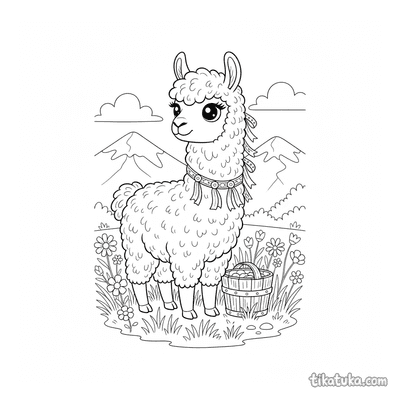 Flauschiges Lama mit Bändern auf einer Bergwiese